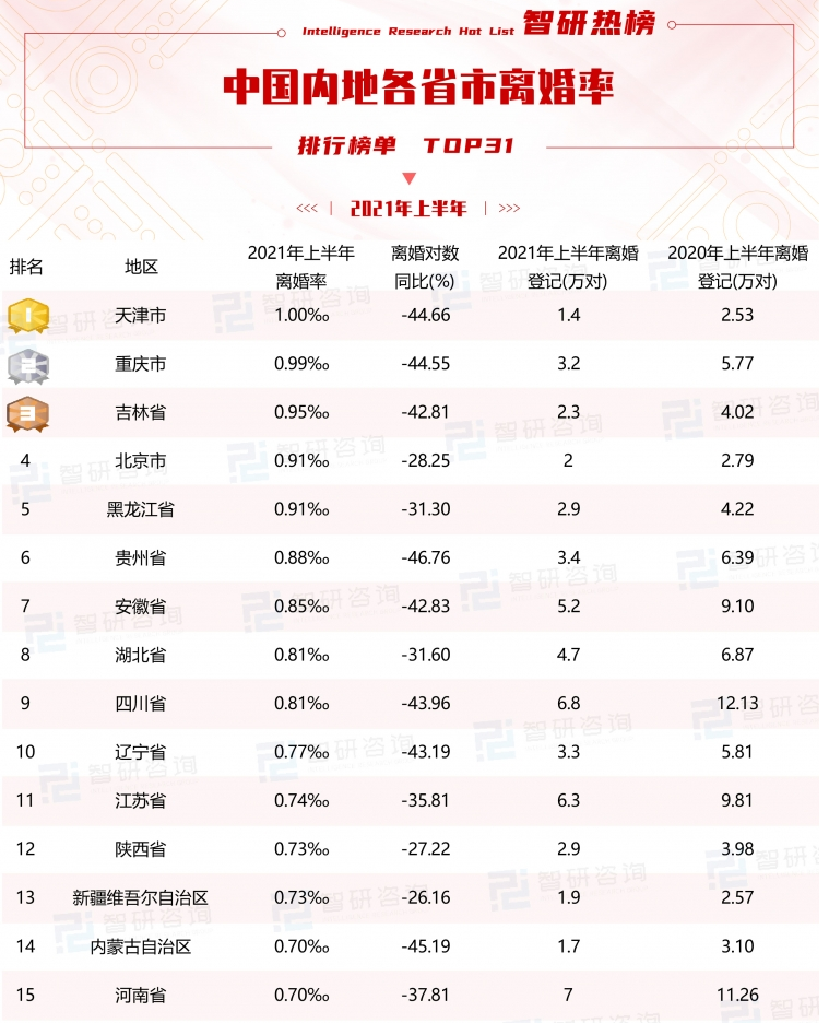其一,从案件的地域分布来看。离婚案件数量排名前十的城市,分别是:广东、北京、山东、浙江、江苏、四川、上海、重庆、河北、广西(见图1)。这个数据结果,与民政部统计的2021年上半年全国不同省份的离婚率排行部分重合(见图2)。要注意的是,排行榜中的离婚率=当年结(离)婚对数/当年平均总人口数x1000‰。上述数据以及其他的相关研究都表明,地区的经济水平越发达,离婚率越高,且东中部地区相较于于西部地区,其经济发展水平对离婚率的影响更明显1。